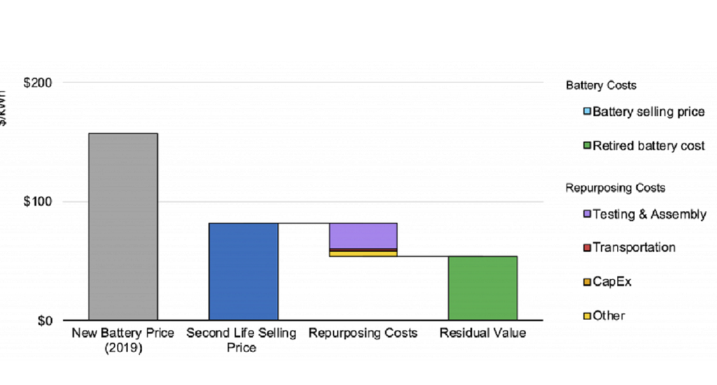 Figure 1: Second life EV batteries can be an attractive choice for inclusion in large scale battery energy storage systems (BESS) because they can cost 25% to 35% less than new batteries. (Source: Ambrose, Union of Concerned Scientists, Blog, May 27, 2020)
